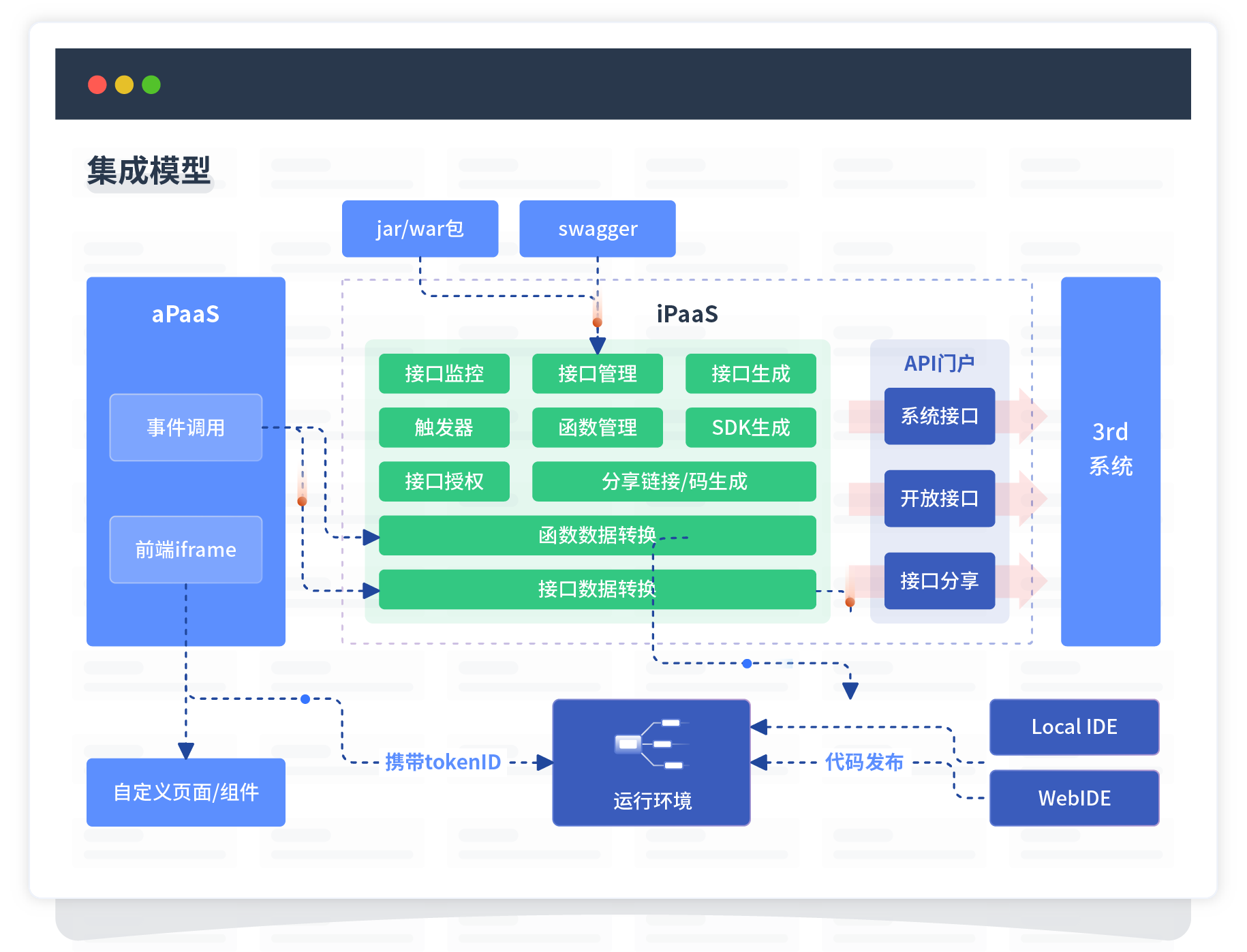 集成模型包括平台本身前、、、、后端能力的扩展,,,也支持通过API门户和第三方系统进行交互。。