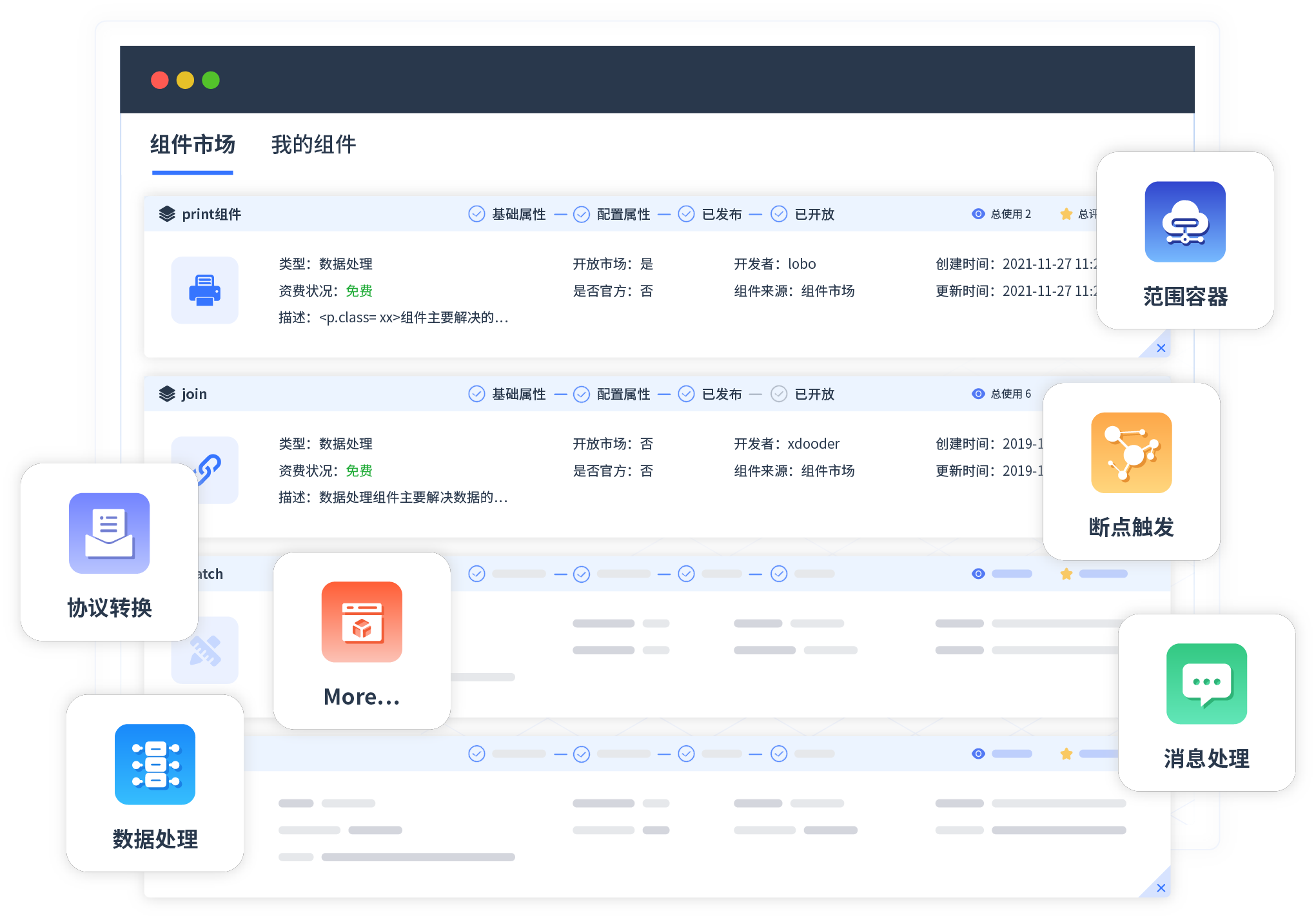 针对集成场景,,,,沃钱包提供组件市场,,,,例如协议转换、、消息处理、、、文件操作等。。除平台提供的组件外,,客户可以自定义所需组件。。。。
