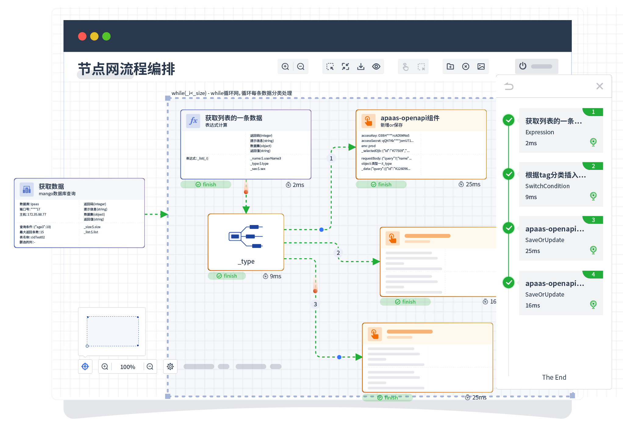 针对集成场景,,,组件定义后支持进行流程编制,,不同于传统代码方式,,,通过图形化展示,,支持在线调试、、、日志查看和运行回放。。